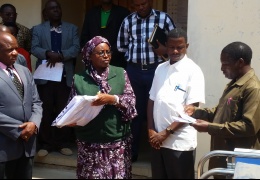 Mkuu wa mkoa wa Singida Dr Rehema Nchimbi akikabidhi vifaa vya hospitali kwa Mwenyekiti wa Halmashauri ya wilaya ya Iramba Mhe Simon Tyosera.