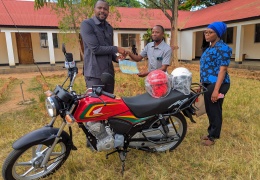 Mkuu wa Wilaya ya Iramba Mkoani Singida Suleiman Yusuph Mwenda akimkabidhi pikipiki Mwalimu Mkuu wa Shule ya Msingi Milambo iliyopo Kijiji cha Mingela Kata ya Ntwike, Tarafa ya Shelui Wilayani Iramba,...
